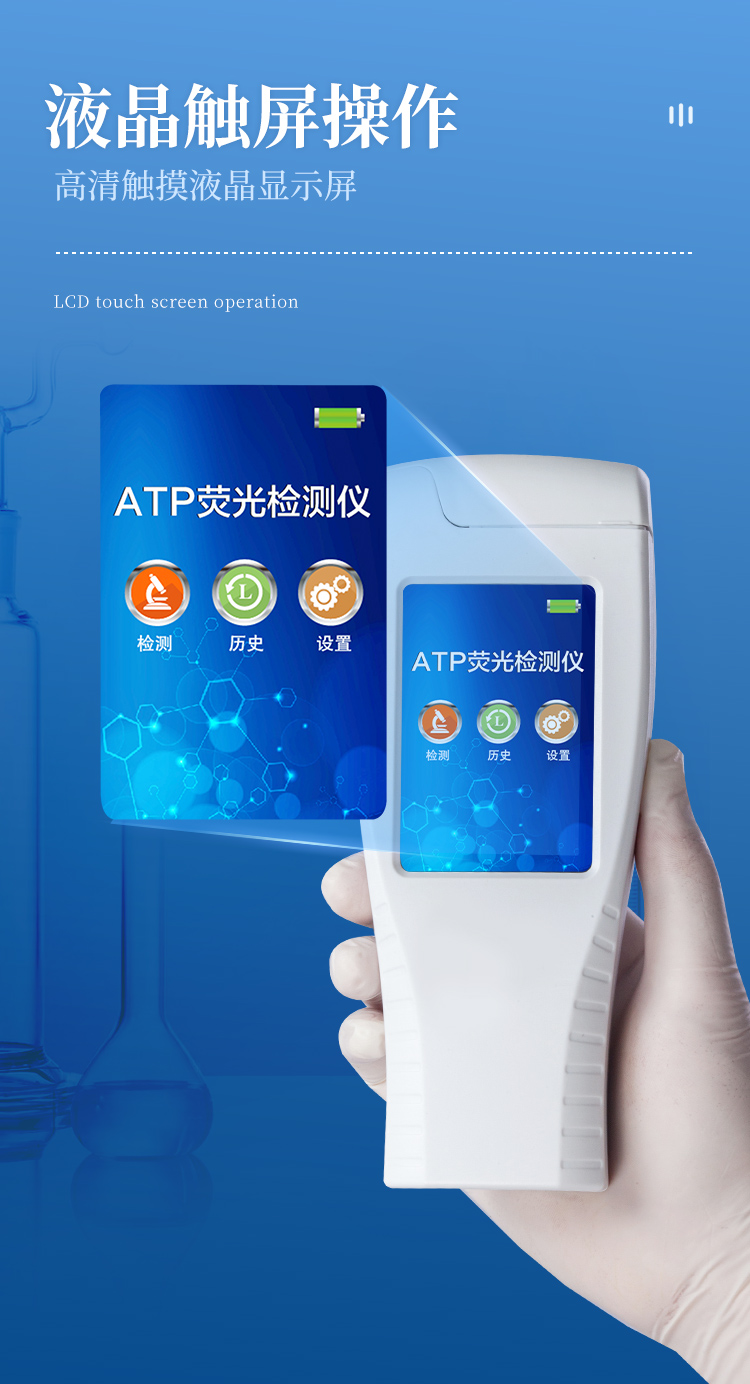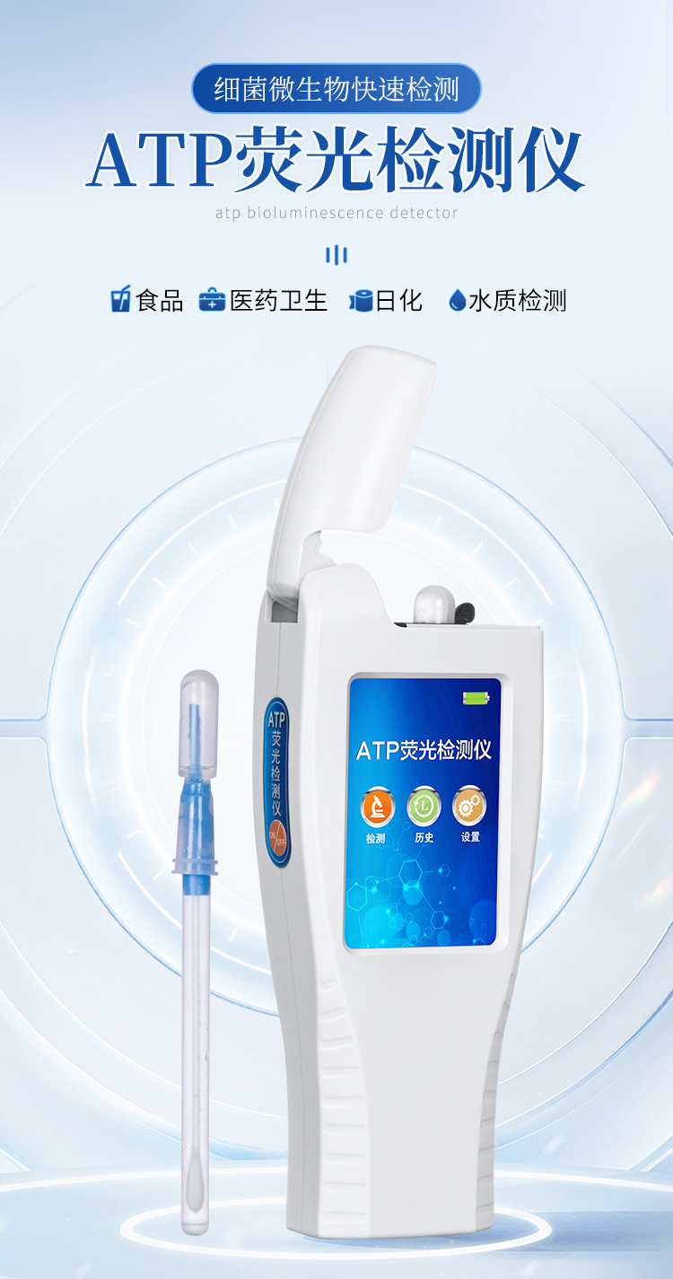 該設(shè)備采用生物化學(xué)反應(yīng)方法檢測(cè)ATP含量,潔凈度檢測(cè)儀基于螢火蟲發(fā)光原理,利用“熒光素酶—熒光素體系”快速檢測(cè)三磷酸腺苷(ATP)。ATP拭子含有可以裂解細(xì)胞膜的試劑,能將細(xì)胞內(nèi)ATP釋放出來,與試劑中含有的特異性酶發(fā)生反應(yīng),產(chǎn)生光,再用熒光照度計(jì)檢測(cè)發(fā)光值,微生物的數(shù)量與發(fā)光值成正比,由于所有生物活細(xì)胞中含有恒量的ATP,所以ATP含量可以清晰地表明樣品中微生物與其他生物殘余的多少,用于判斷衛(wèi)生狀況。