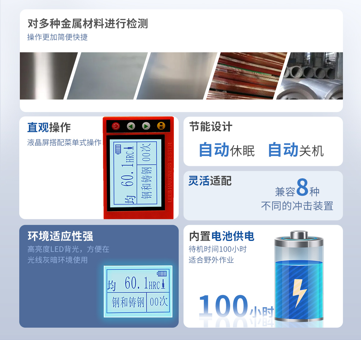| 測(cè)量范圍 | (127~651)HB,(59.6~99.6)HRB,(17.9~68.5)HRC,(59.1~85.8)HRA,(83~976)HV,(32.2~99.5)HS,(150-960)HLD,可定制測(cè)量值范圍 |