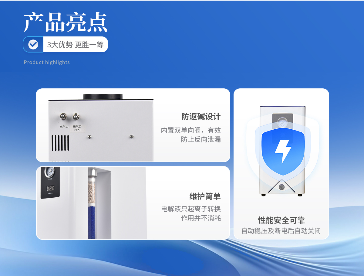| 1、可取代高壓氮氣瓶,使實驗室儀器化。 | 2、操作簡便,只需啟動電源開關(guān),儀器即可產(chǎn)氮且輸出壓力穩(wěn)定。 | 3、不消耗電解液;電解液只起離子轉(zhuǎn)換作用并不消耗,所以只需補充因蒸發(fā)而損失的少量蒸餾水。 | 4、產(chǎn)氣純度高,空氣經(jīng)電解池分離后即可得到高純氮氣。 | 5、性能安全可靠:具有穩(wěn)壓和斷電后自動關(guān)閉氣路功能。 | 6、壽命長,既可間斷使用,又可連續(xù)使用且產(chǎn)氣量穩(wěn)定、不衰減。 | 7、**節(jié)能:采用**的開關(guān)電源,提高了電解效率。 | 8、配有雙單向閥,自動防返堿。 |