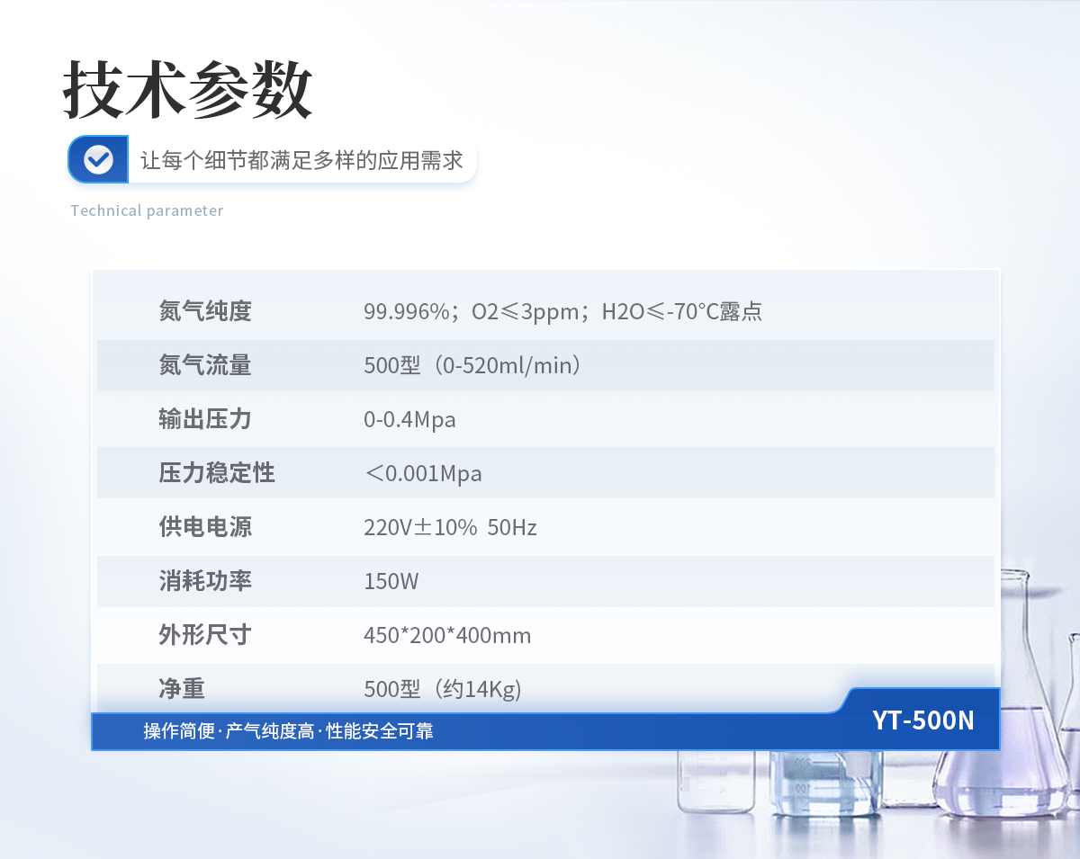 | 1、氮氣純度: 99.996%;O2≤3ppm;H2O≤-70℃露點 | 2、氮氣流量: 0-320ml/min | 3、輸出壓力: 0-0.4Mpa | 4、壓力穩(wěn)定性:<0.001Mpa | 5、供電電源: 220V±10% 50Hz | 6、消耗功率: 120W | 7、外形尺寸: 450*200*400mm | 8、凈重: 300型(約14Kg) |