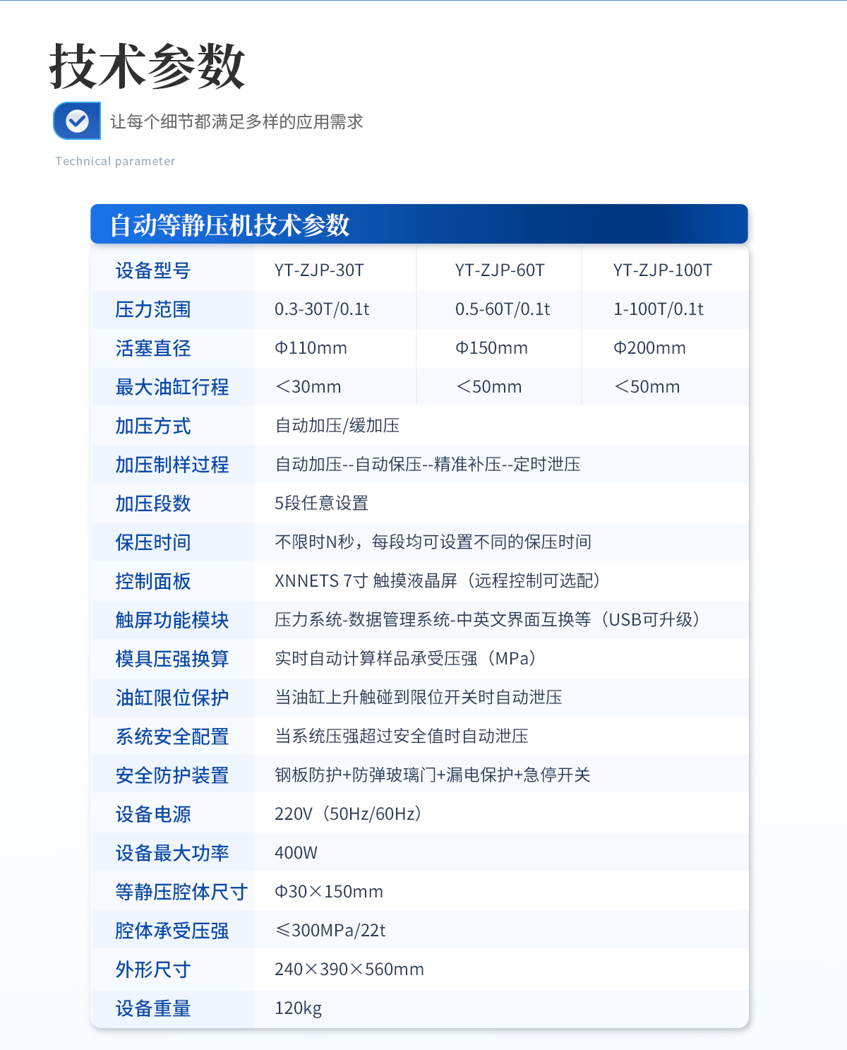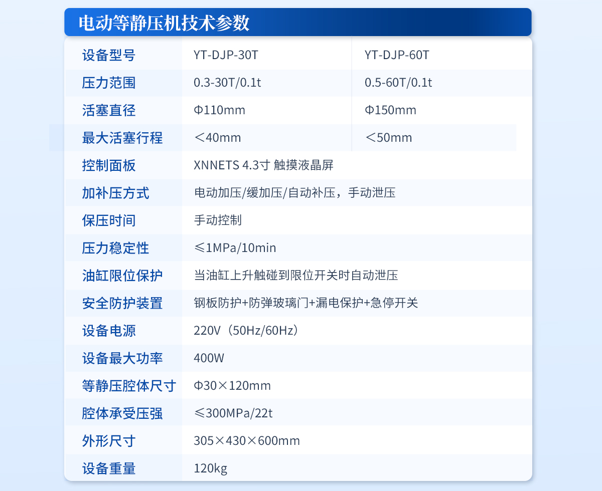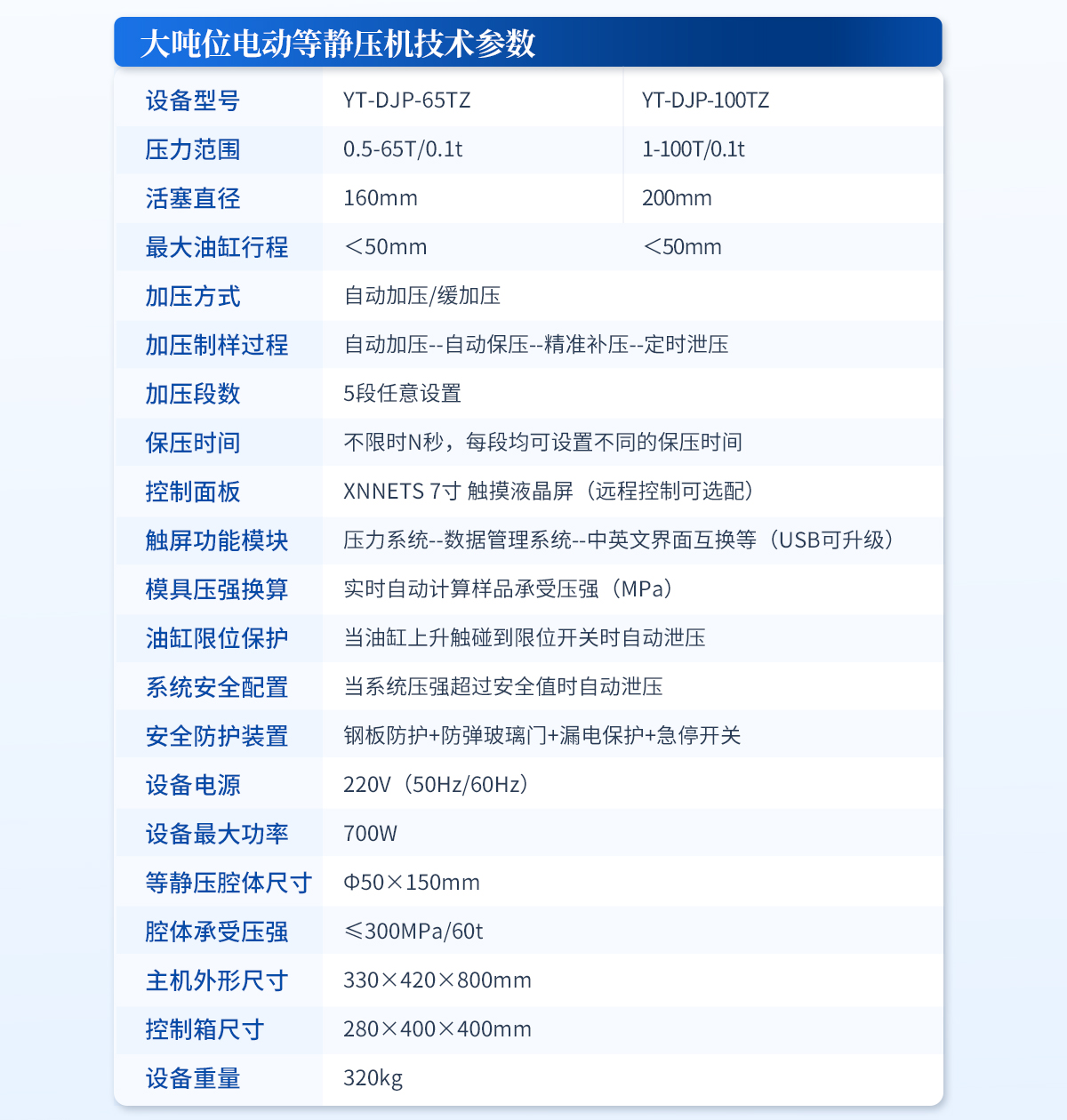 | 規(guī)格型號:YT-DJP-30T | 壓力范圍:0.3-30T/0.1t | 活塞直徑 :Φ110mm | **油缸行程:<40mm | 控制面板:XNNETS 4.3寸 觸摸液晶屏 | 加補(bǔ)壓方式:電動(dòng)加壓/緩加壓/自動(dòng)補(bǔ)壓,手動(dòng)泄壓 | 保壓時(shí)間:手動(dòng)控制 | 壓力穩(wěn)定性:≤1MPa/10min | 油缸限位保護(hù):當(dāng)油缸上升觸碰到限位開關(guān)時(shí)自動(dòng)泄壓 | 安全防護(hù)裝置:鋼板防護(hù)+防彈玻璃門+漏電保護(hù)+急停開關(guān) | 設(shè)備電源:220V(50Hz/60Hz) | 設(shè)備**功率:400W | 等靜壓腔體尺寸:Φ30×120mm | 腔體承受壓強(qiáng):≤300MPa/22t | 外形尺寸:305×430×600mm | 設(shè)備重量:120kg | 配置說明:油壓機(jī)1臺,等靜壓腔體1套!可根據(jù)需求定制500MPa等靜壓機(jī)或橡膠模具 |