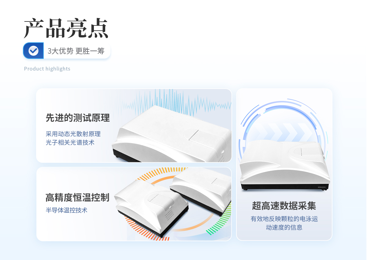 | 雙波長(zhǎng)激光器,全自動(dòng)切換 獨(dú)家采用雙波長(zhǎng)(λ= 405nm、λ= 532nm)激光器搭建而成的光路系統(tǒng),相關(guān)譜探測(cè)系統(tǒng)不僅體積小,而且具有很強(qiáng)的抗干擾能力,從而保證了測(cè)試的穩(wěn)定性;對(duì)某些具有吸光屬性,傳統(tǒng)單一波長(zhǎng)激光器無(wú)法檢測(cè)的樣品,可進(jìn)行有效檢測(cè); | **的測(cè)試原理 采用動(dòng)態(tài)光散射原理和光子相關(guān)光譜技術(shù),根據(jù)顆粒在液體中的布朗運(yùn)動(dòng)速度測(cè)定顆粒大小。大小顆粒運(yùn)動(dòng)速度不同,激光照射這些顆粒,不同大小的顆粒將使散射光發(fā)生快慢不同的漲落起伏。光子相關(guān)光譜法就根據(jù)特定方向的光子漲落起伏分析其顆粒大小。 | 超高速數(shù)據(jù)采集 使用PCS技術(shù)測(cè)定納米級(jí)顆粒大小,必須能夠分辨納秒級(jí)信號(hào)起伏。本儀器的核心部件采用我公司研制的CR256數(shù)字相關(guān)器,具有識(shí)別8ns的**分辨能力和**的信號(hào)處理速度,其數(shù)據(jù)處理速度高達(dá)162M。它能實(shí)時(shí)完成動(dòng)態(tài)散射光強(qiáng)的采集和自相關(guān)函數(shù)運(yùn)算,從而有效地反映不同大小顆粒的動(dòng)態(tài)分光散射信息,為測(cè)試結(jié)果的準(zhǔn)確性典型基礎(chǔ)。 | 高靈敏度和信噪比 采用專業(yè)級(jí)高性能光電倍增管,對(duì)光子信號(hào)具有**的靈敏度和信噪比。 | 高精度雙溫控保護(hù)系統(tǒng) 采用半導(dǎo)體溫控技術(shù),樣品池溫控系統(tǒng)和激光器溫控系統(tǒng)精度高達(dá)±0.1℃,使被測(cè)樣品和激光器光源在整個(gè)測(cè)試過(guò)程中都處于恒溫狀態(tài),避免溫度變化對(duì)不測(cè)試結(jié)果的影響,確保測(cè)試準(zhǔn)確和重復(fù); | 穩(wěn)定的光路系統(tǒng) 采用光纖技術(shù)搭建而成的光路系統(tǒng),使光子相關(guān)譜探測(cè)系統(tǒng)不僅體積小,而且具有很強(qiáng)的抗干擾能力,從而保證了測(cè)試的穩(wěn)定性。 |