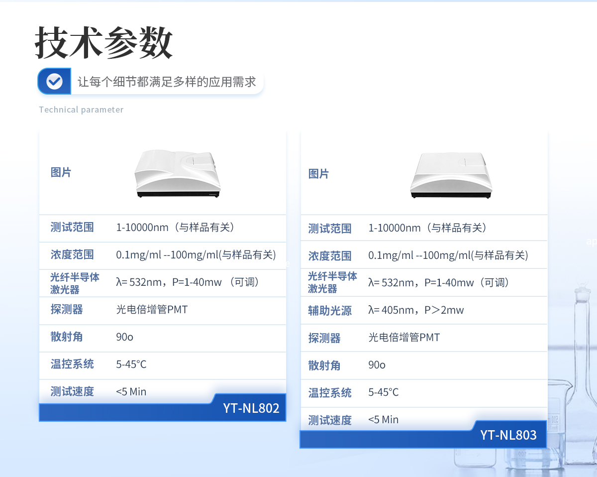 | 規(guī)格型號(hào):YT-NL803 | 執(zhí)行標(biāo)準(zhǔn):GB/T 19627-2005/ISO 13321-1996 GB/T 29022-2012/ISO 22412-2008 | 測(cè)試范圍 :1-10000nm(與樣品有關(guān)) | 濃度范圍:0.1mg/ml--100mg/ml(與樣品有關(guān)) | 準(zhǔn)確度誤差:<1%(國(guó)家標(biāo)準(zhǔn)樣品d50值)> | 重復(fù)性誤差:<1%(國(guó)家標(biāo)準(zhǔn)樣品d50值)> | 激光光源:光纖半導(dǎo)體激光器,λ= 532nm,P=1-40mw(可調(diào)) 輔助激光器,λ= 405nm,P>2mw | 探測(cè)器:光電倍增管PMT | 散射角:90o | 樣品池體積:10mm*10mm*40mm, 1--4mL | 溫控范圍:5-45℃ | 溫控精度:0.1℃ | 測(cè)試速度:<5 min=""> | 數(shù)字相關(guān)器主要參數(shù): (1)規(guī)格型號(hào) CR256 (2)自相關(guān)通道 256 (3)基線通道 4 (4)物理通道數(shù) 5000 (5)延遲時(shí)間 100ns-10ms(可調(diào)) | 體積:480mm*270mm*170mm | 重量:12Kg |