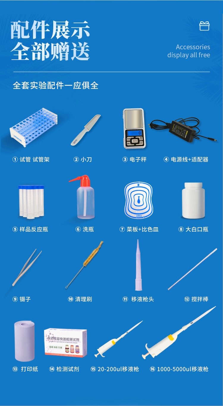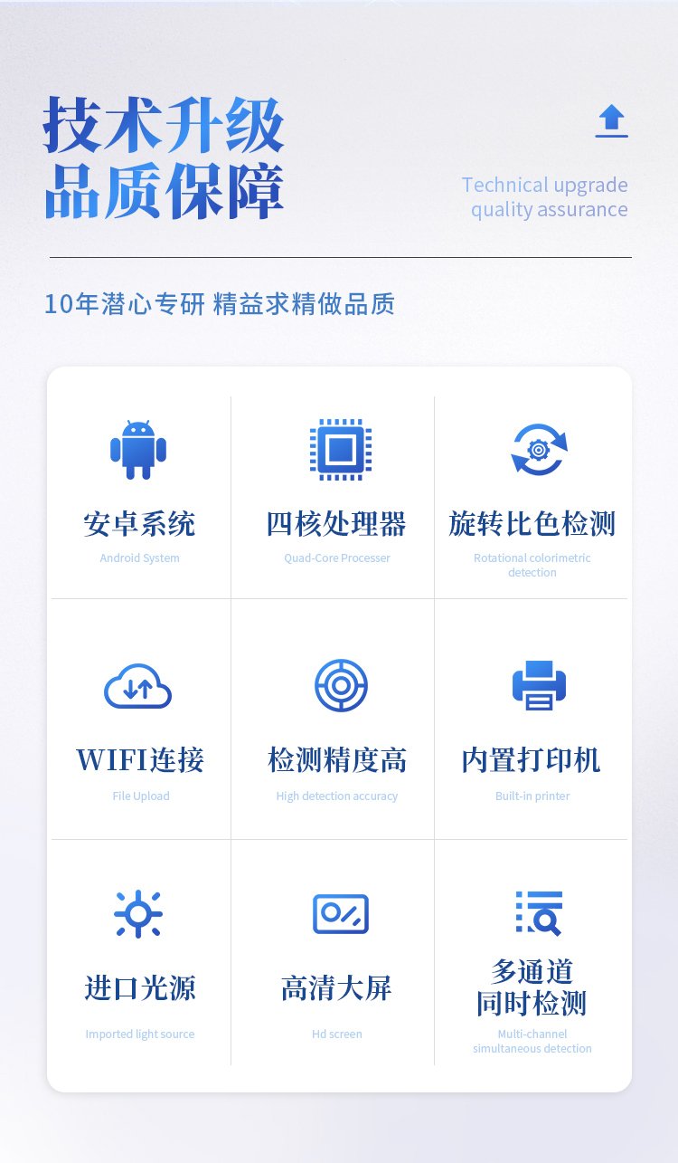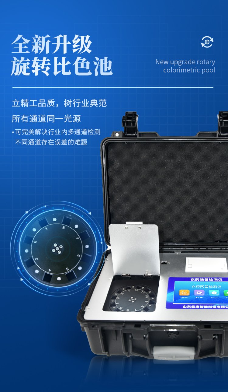 | 機器采用全新安卓智能系統(tǒng),主控芯片采用 ARM Cortex-A7,RK3288/4核處理器,主頻1.88Ghz,運轉(zhuǎn)速度更快速,穩(wěn)定性更強。 | 創(chuàng)新檢測模式: *儀器采用精密旋轉(zhuǎn)比色池設(shè)計,使用光源一致,可以解決各通道間由于光源誤差帶來的檢測結(jié)果誤差問題,檢測結(jié)果更加精準。 *儀器具有自動識別比色皿檢測功能,即:將樣品比色皿放入儀器后,點擊樣品檢測,儀器自動識別比色皿進行通道檢測。 | 供電方式:交直流兩用,直流 12V 供電,可連接車載電源,可配 6ah 大容量充電鋰電池,方便戶外流動測試。 | 顯示方式:7英寸液晶觸摸屏顯示,人性化中文操作界面,讀數(shù)直觀、簡單。 | 檢測通道:12個檢測通道,可以同時測試多個樣品,循環(huán)檢測,即放即檢,每個樣品由程序控制分別獨立工作,不會互相干擾。 | 高精光源系統(tǒng): ①儀器光源采用進口超高亮發(fā)光二極管,光源亮度可以自動調(diào)節(jié)與校準 ②智能恒流穩(wěn)壓,光強自動校準,長時間連續(xù)工作光源無溫漂現(xiàn)象。 | 智能操作分析系統(tǒng): ①儀器具有100多種蔬菜名稱菜單庫,分類管理,并可按需添加或刪除、編輯蔬菜名稱;可在同一檢測界面自動對應(yīng)相關(guān)檢測通道一次性選擇1-24個樣品名稱,無需退出界面,節(jié)省操作時間。 ②內(nèi)置新國家限量標(biāo)準,與所測結(jié)果進行現(xiàn)場比對,并持續(xù)更新標(biāo)準。 | 完善的配套硬件: ①采用串口5v打印機,可選擇手動打印或者自動打印,三分鐘出打印結(jié)果,打印格式為檢測人姓名、吸光度差值、檢測時間、檢測機構(gòu)、樣品名稱及結(jié)果判定。 ②儀器具有無線上傳模塊,檢測結(jié)果可批量打印,批量上傳。 | 數(shù)據(jù)調(diào)用: ①儀器可存儲20萬條檢測結(jié)果, ②檢測結(jié)果為Excel表格,方便后期進行數(shù)據(jù)分析與匯總報告 ③儀器采用USB2.0接口設(shè)計,支持 U 盤存儲,方便數(shù)據(jù)的存貯和移動,并可隨時與計算機直接相連,實現(xiàn)數(shù)據(jù)查詢、瀏覽、分析、統(tǒng)計、打印等。 | 后期產(chǎn)品固件可升級。 | 安全證書,放心保障:儀器具有中國計量科學(xué)研究院校準證書,權(quán)威認證,使用放心。 | 機箱采用工業(yè)級ABS工程塑料箱,方便攜帶,穩(wěn)固耐用,便于流動測試。 |