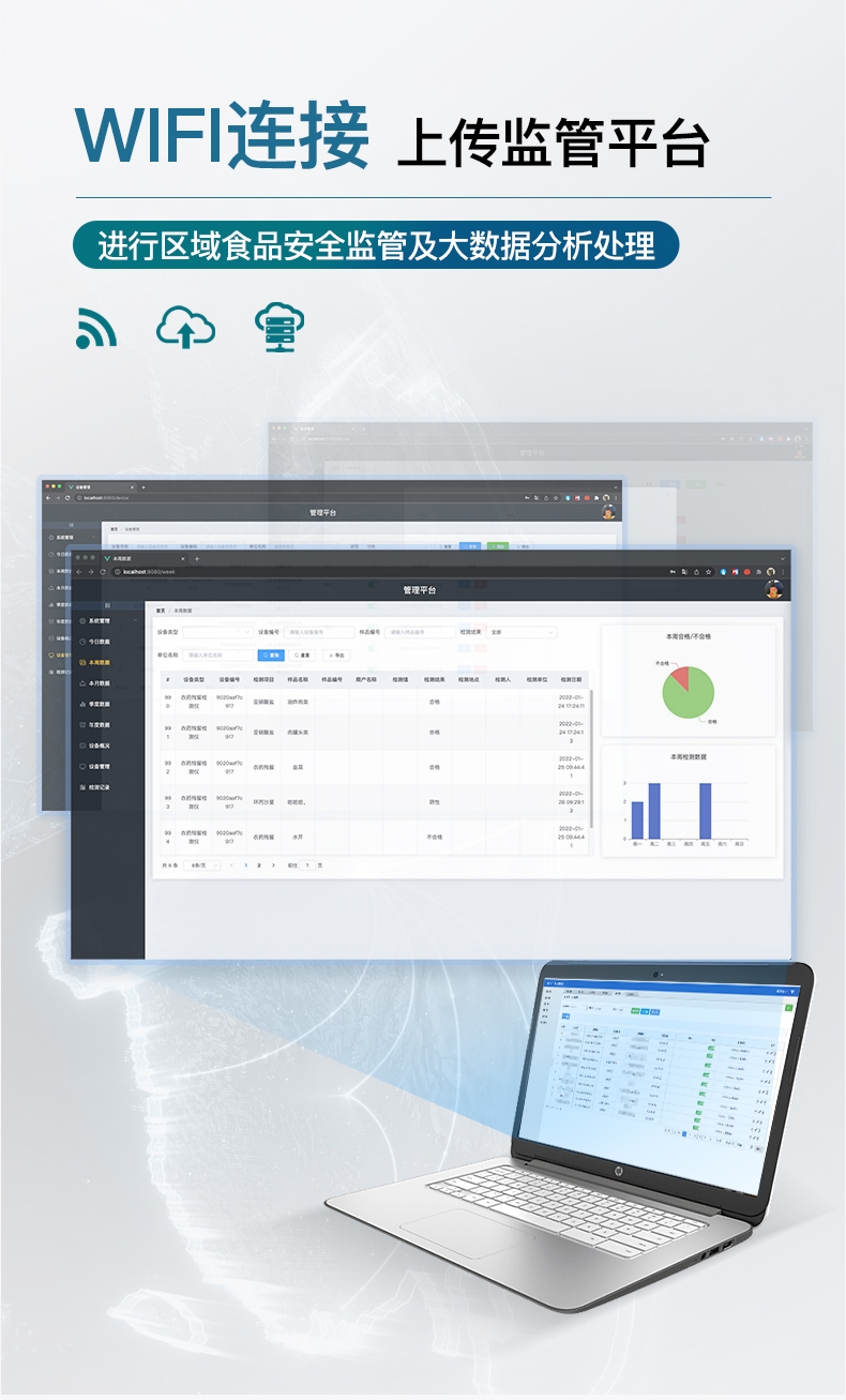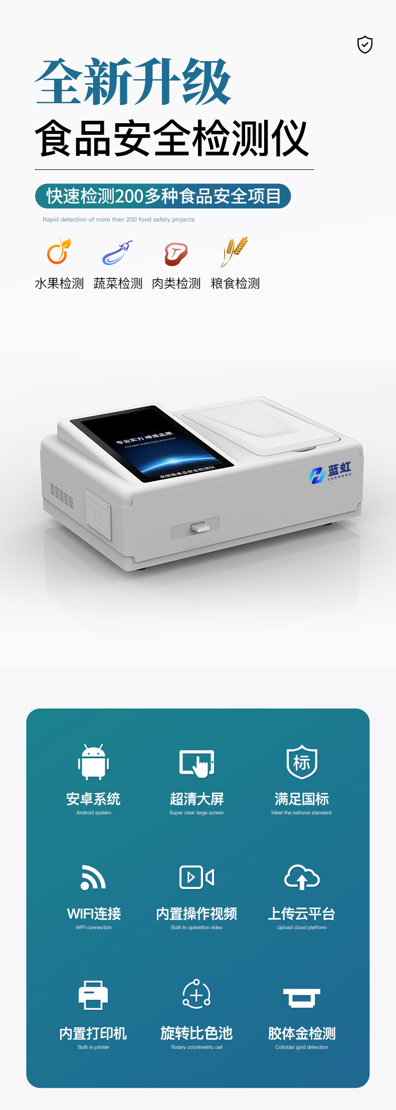 | 儀器采用手提式一體化系統(tǒng)檢測技術(shù),將分光光度模塊、數(shù)字化管理模塊、無線通訊模塊高度集成于一體,支持檢測200種食品安全檢測項(xiàng)目,同時預(yù)留升級檢測方法。 | 儀器檢測模塊標(biāo)準(zhǔn)化、智能化,檢測項(xiàng)目可隨意自由組合。檢測箱體內(nèi)置多個標(biāo)準(zhǔn)檢測單元,檢測模塊可以調(diào)整配置。 | 顯示屏幕:儀器采用10.1英寸豎向液晶觸摸屏顯,搭配運(yùn)行安卓智能操作系統(tǒng),主控芯片采用ARM Cortex-A7,RK3288/4核處理器,主頻1.88Ghz,操作方便,性能更強(qiáng)。 | 檢測通道:≥12通道;采用精密旋轉(zhuǎn)比色池設(shè)計,使用同芯片同光源校準(zhǔn)精度,解決不同光源之間的誤差值,更加準(zhǔn)確**。(1-12通道間誤差0.1%,***:**202022821055.2) | 儀器光源:高精度進(jìn)口四波長冷光源,每個通道均配置 410、520、590、630nm 波長光源,標(biāo)配**的光路切換裝置,專利光路切換功能可實(shí)現(xiàn)64波長,并且所有檢測項(xiàng)目可實(shí)現(xiàn)所有通道同時檢測。 | 設(shè)備可一鍵校準(zhǔn),自動保存校準(zhǔn)數(shù)據(jù),自動對比校驗(yàn),得到精準(zhǔn)光源,采用Android SP存儲數(shù)據(jù),光源數(shù)據(jù)永不丟失,方便每一次使用。 | 通訊接口:配備無線通信模塊、可選配4G(APN)通訊模塊和藍(lán)牙傳輸,同時具有雙USB接口以及RJ45網(wǎng)線接口,可以多方式實(shí)現(xiàn)數(shù)據(jù)保存及數(shù)據(jù)傳輸。 | 存儲方式:支持U盤存儲,標(biāo)準(zhǔn)USB接口,免驅(qū)動安裝。檢測結(jié)果存儲容量20萬條以上,可生成Excel表格進(jìn)行拷貝,并具有登錄保護(hù)功能。 | 智能化操作系統(tǒng): | 1)操作系統(tǒng):儀器可在同一檢測界面自動對應(yīng)相關(guān)檢測通道,一次性選擇1-12個樣品名稱,無需退出界面,節(jié)省操作時間。并可以對每個通道屬性和樣品信息單獨(dú)進(jìn)行編輯,例如送檢單位、人員,檢測人員等,打印時勾選打印顯示。 | 2)數(shù)據(jù)集成系統(tǒng):設(shè)備首頁自動匯總分析檢測數(shù)據(jù),包含:周檢測數(shù)據(jù)、月檢測數(shù)據(jù),全部檢測總數(shù)量,均包含檢測總數(shù),合格數(shù),不合格數(shù),以及相關(guān)柱形分析圖,各項(xiàng)檢測數(shù)據(jù)一目了然,無需電腦查詢,更加快捷直觀。 | 3)數(shù)據(jù)庫系統(tǒng):十幾項(xiàng)數(shù)據(jù)庫分類管理儀器:包含項(xiàng)目類型、項(xiàng)目數(shù)據(jù)、檢測數(shù)據(jù)、歷史記錄、國標(biāo)信息、曲線信息、采樣信息、檢測信息、受檢信息、復(fù)核信息、圖表信息、光源校準(zhǔn)信息、打印樣式信息、樣品庫信息等等,數(shù)據(jù)庫之間互相協(xié)調(diào)聯(lián)動保證數(shù)據(jù)的真實(shí)完整性。同時產(chǎn)品數(shù)據(jù)庫以及歷史檢測記錄支持一鍵檢索功能。 | 4)限量規(guī)判系統(tǒng):具有限量查詢、添加物質(zhì)合規(guī)判定系統(tǒng)。檢測出結(jié)果后,系統(tǒng)自動調(diào)用系統(tǒng)數(shù)據(jù)庫中相關(guān)國標(biāo)進(jìn)行比對判定,客觀顯示判定結(jié)果是否合格。 | 5)項(xiàng)目預(yù)設(shè)系統(tǒng):儀器具有任務(wù)預(yù)設(shè)模塊,一鍵提前預(yù)設(shè),給出方便快捷的新檢測方案,每一個任務(wù)分別可以設(shè)置不同的樣品、批次、編號、來源、備注、抽樣信息、檢測信息、受檢信息、復(fù)核信息等更多信息。樣品送檢時一鍵調(diào)取保存信息,并可多次調(diào)取,大大提高檢測效率。 | 6)數(shù)據(jù)監(jiān)管系統(tǒng):同步對接監(jiān)管平臺,數(shù)據(jù)可局域網(wǎng)和互聯(lián)網(wǎng)數(shù)據(jù)上傳,檢測結(jié)果可選擇直接傳至食品安全監(jiān)管平臺。進(jìn)行區(qū)域食品安全監(jiān)管及大數(shù)據(jù)分析處理與數(shù)據(jù)統(tǒng)計,檢測區(qū)域食品安全長短期動態(tài),達(dá)到食品安全問題預(yù)估、預(yù)警。 | 7)打印系統(tǒng):內(nèi)置全新打印機(jī),新創(chuàng)自定義打印方式,可按需靈活勾選控制:產(chǎn)品合格證(國家農(nóng)業(yè)部標(biāo)準(zhǔn)要求),二維碼,抽樣信息、檢測信息,受檢信息、復(fù)核信息、抽樣日期、檢測日期等信息的打印。 | 供電模式:儀器交直流兩用,直流12V供電,可連接車載電源,可配6ah大容量充電鋰電池,電量可實(shí)時顯示,方便戶外流動測試。 | 儀器加入遠(yuǎn)程升級功能,可定向分客戶分儀器更新,開機(jī)后自動更新,客戶無需任何操作,即可升級全新項(xiàng)目。做到了無需退換機(jī)器即可實(shí)現(xiàn)實(shí)時遠(yuǎn)程升級檢測儀器。 | 設(shè)備尺寸:(長*寬*高)440*300*180mm | 儀器加入遠(yuǎn)程升級功能,可定向分客戶分儀器更新,開機(jī)后自動更新,客戶無需任何操作,即可升級全新項(xiàng)目。做到了無需退換機(jī)器即可實(shí)現(xiàn)實(shí)時遠(yuǎn)程升級檢測儀器。 |