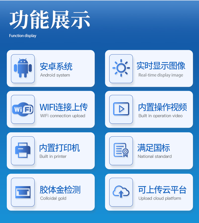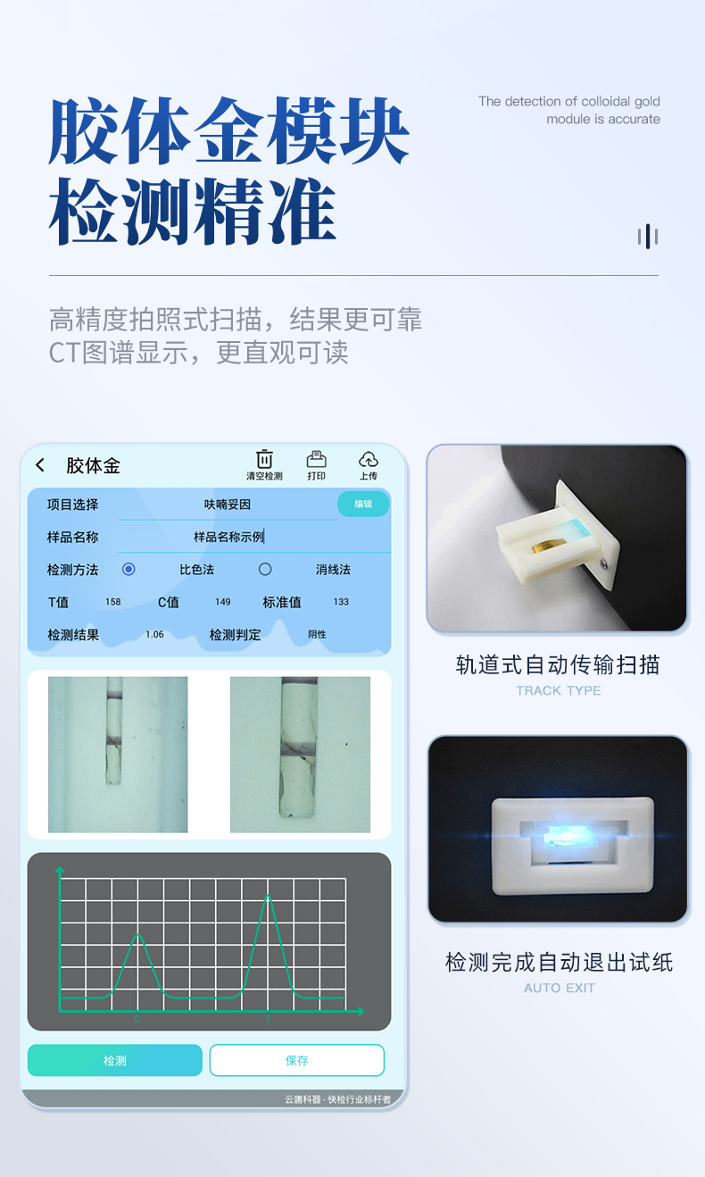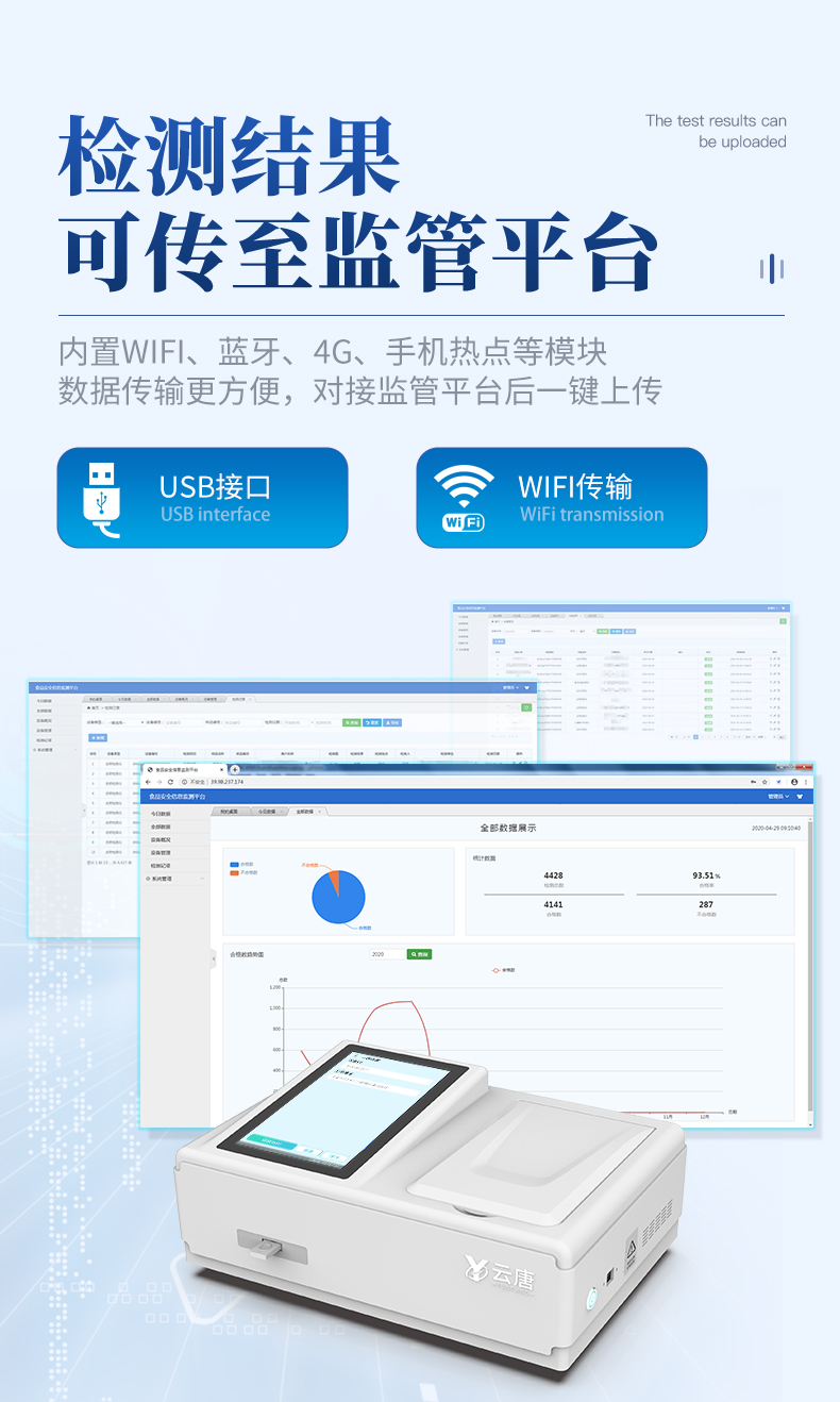 | 儀器采用10.1英寸液晶觸摸屏顯,搭配運(yùn)行安卓智能操作系統(tǒng),主控芯片采用ARM Cortex-A7,RK3288/4核處理器,主頻1.88Ghz,運(yùn)轉(zhuǎn)速度更快速,性能更強(qiáng)。 | 儀器功能包括:膠體金檢測(cè)模塊、數(shù)字化管理模塊、無(wú)線通訊模塊等,可以滿足同一軟件下實(shí)現(xiàn)所有檢測(cè)項(xiàng)目的檢測(cè),并在同一窗口展示檢測(cè)結(jié)果。 | 一體化臺(tái)式快檢設(shè)備,采用交直流兩用供電方式,可連接車載電源,配備6ah大容量充電鋰電池,可以滿足現(xiàn)場(chǎng)及流動(dòng)檢測(cè)使用的需求。儀器尺寸:43×35×20cm, 主機(jī)凈重:5.1kg | 系統(tǒng)自帶數(shù)據(jù)集成模塊,設(shè)備首頁(yè)自動(dòng)統(tǒng)計(jì)檢測(cè)數(shù)據(jù)包含:周檢測(cè)數(shù)據(jù)、月檢測(cè)數(shù)據(jù),全部檢測(cè)總數(shù)量,均包含檢測(cè)總數(shù),合格數(shù),不合格數(shù),以及相關(guān)柱形分析圖,對(duì)各項(xiàng)檢測(cè)數(shù)據(jù)清晰掌握,無(wú)需電腦查詢,更加快捷直觀。 | 儀器具有任務(wù)預(yù)設(shè)模塊,可在樣品送檢前提前預(yù)設(shè)樣品名稱、檢測(cè)指標(biāo)、送檢單位等信息,樣品送檢時(shí)一鍵調(diào)取保存信息,檢測(cè)更加方便快捷。 | 膠體金檢測(cè)模塊: 直插式自動(dòng)掃描方式,可實(shí)時(shí)顯示金標(biāo)卡實(shí)時(shí)圖像,系統(tǒng)自動(dòng)分析并呈現(xiàn)出CT曲線圖,CT線自動(dòng)識(shí)別,無(wú)需手動(dòng)調(diào)整,完成檢測(cè)后自動(dòng)退出檢測(cè)卡。 結(jié)果判定線可修改,對(duì)照值標(biāo)定值可保存,斷電不丟失數(shù)據(jù)。 兼容市場(chǎng)上其他膠體金卡,使用耗材不受限制,極大增強(qiáng)用戶使用體驗(yàn)。 | 儀器檢測(cè)系統(tǒng)擁有龐大數(shù)據(jù)庫(kù),并且構(gòu)建了完善的檢索、修訂功能。食品庫(kù)涵蓋多種樣品名稱,可按需添加或刪除、編輯樣品名稱;產(chǎn)品數(shù)據(jù)庫(kù)以及歷史檢測(cè)記錄支持一鍵檢索功能。 | 系統(tǒng)打印自定義化,打印格式多樣化,產(chǎn)品合格證(國(guó)家標(biāo)準(zhǔn)要求),二維碼,抽樣信息、檢測(cè)信息,受檢信息、復(fù)核信息、抽樣日期、檢測(cè)日期等信息結(jié)果,可按需求自行設(shè)置打印內(nèi)容。 | A4紙版本報(bào)告打印功能(可選配):設(shè)備擁有兩種結(jié)果展示方式,可以自動(dòng)生成A4打印模板和小票打印模板兩種樣式,可通過(guò)WiFi及網(wǎng)線等方式鏈接外置打印機(jī)可進(jìn)行打印 | 儀器具有 wifi 聯(lián)網(wǎng)上傳、RJ45網(wǎng)線連接功能,可以快速上傳數(shù)據(jù)。同步對(duì)接監(jiān)管平臺(tái),數(shù)據(jù)可局域網(wǎng)和互聯(lián)網(wǎng)數(shù)據(jù)上傳,檢測(cè)結(jié)果直接傳至食品安全監(jiān)管平臺(tái)。進(jìn)行區(qū)域食品安全監(jiān)管及大數(shù)據(jù)分析處理與數(shù)據(jù)統(tǒng)計(jì),檢測(cè)區(qū)域食品安全長(zhǎng)短期動(dòng)態(tài),達(dá)到食品安全問(wèn)題預(yù)估、預(yù)警。 | 設(shè)備支持U盤存儲(chǔ),標(biāo)準(zhǔn)USB接口,免驅(qū)動(dòng)安裝。檢測(cè)結(jié)果存儲(chǔ)容量20萬(wàn)條以上,可生成Excel表格,進(jìn)行一鍵拷貝,并具有登錄保護(hù)功能,可設(shè)置用戶名及密碼,規(guī)范不同人員操作權(quán)限,防止非工作人員操作,并且可以進(jìn)行重新校準(zhǔn)、鎖定、恢復(fù)出廠設(shè)置功能。儀器固件可升級(jí),后期檢測(cè)項(xiàng)目可擴(kuò)充。 | 儀器具備遠(yuǎn)程升級(jí)功能,可定向分客戶分儀器更新,開機(jī)后自動(dòng)更新,并可持續(xù)性免費(fèi)更新系統(tǒng)版本,無(wú)需像傳統(tǒng)產(chǎn)品返廠更新,節(jié)省時(shí)間及人力成本并避免了物流運(yùn)輸返廠升級(jí)導(dǎo)致設(shè)備損壞的潛在風(fēng)險(xiǎn)。 |