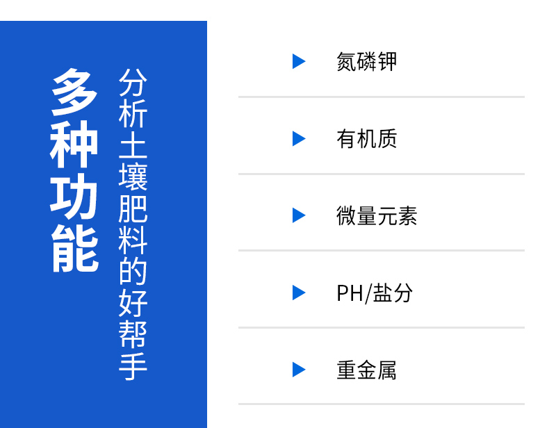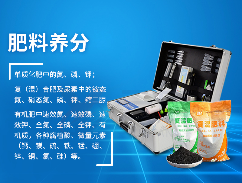 肥料養(yǎng)分:● 單質(zhì)化肥中的氮、磷、鉀; ● 復(fù)(混)合肥及尿素中的銨態(tài)氮、磷、鉀; ● 有機肥中速效氮、速效磷、速效鉀、全氮、全磷、全鉀、pH、有機質(zhì)等。