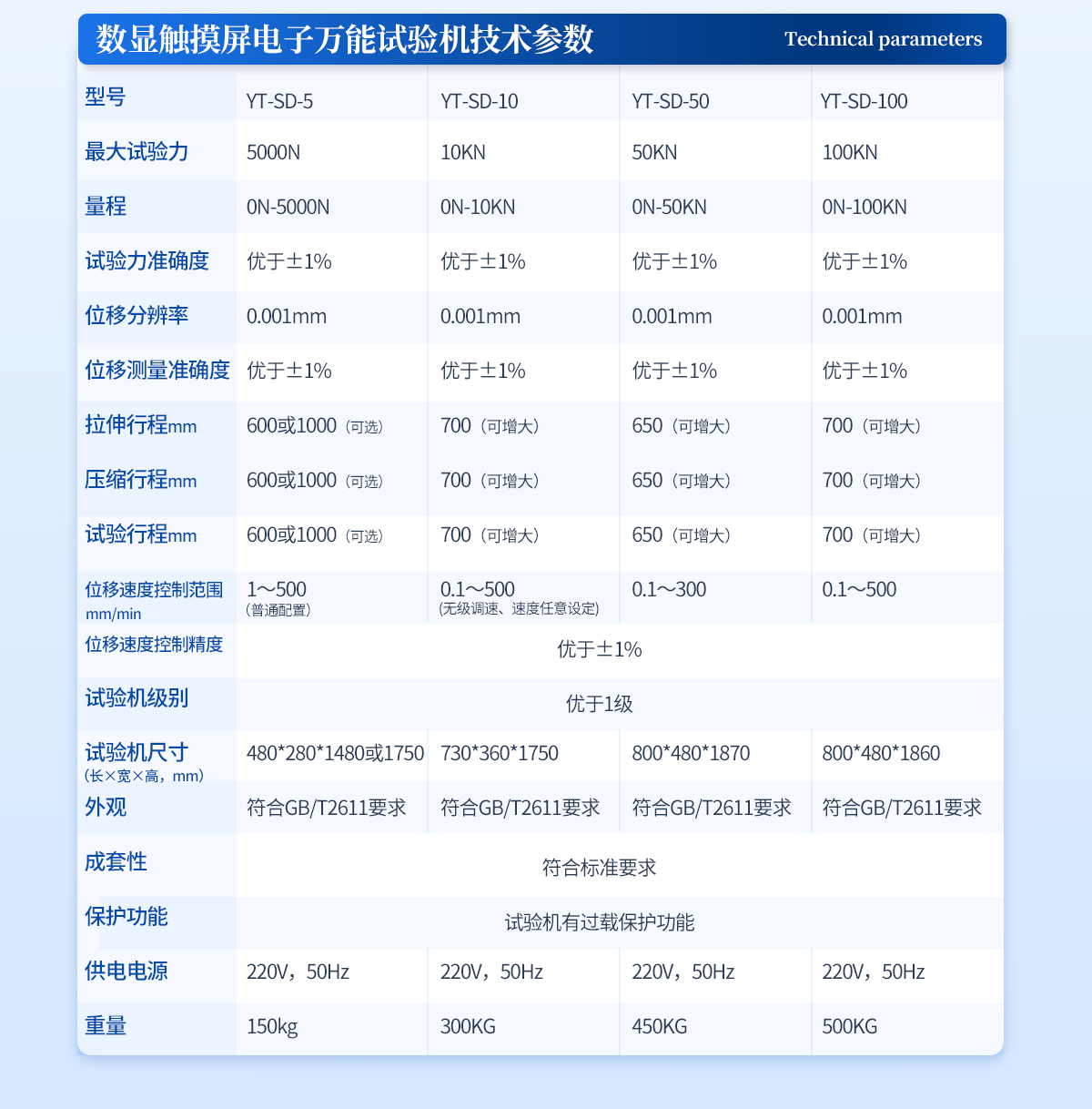| 1、**試驗(yàn)力:10KN ; | 2、量 程:0N-10KN; | 3、試驗(yàn)力準(zhǔn)確度;優(yōu)于±1%,(試驗(yàn)力全程不分檔,全程分辨率不變) | 4、位移分辨率:0.001mm; | 5、位移測(cè)量準(zhǔn)確度:優(yōu)于±1%; | 6、拉伸行程:700mm(可增大) | 7、壓縮行程:700mm(可增大) | 8、試驗(yàn)行程:700mm(可增大) | 9、位移速度控制范圍: 0.1mm/min~500mm/min(無級(jí)調(diào)速、速度任意設(shè)定) | 10、位移速度控制精度:優(yōu)于±1%; | 11、試驗(yàn)機(jī)級(jí)別:優(yōu)于1級(jí) | 12、試驗(yàn)機(jī)尺寸:730*360*1750 mm | 13、外觀:符合GB/T2611要求 | 14、成套性:符合標(biāo)準(zhǔn)要求 | 15、保護(hù)功能:試驗(yàn)機(jī)有過載保護(hù)功能 | 16、供電電源:220V,50Hz | 17、重量:300KG |