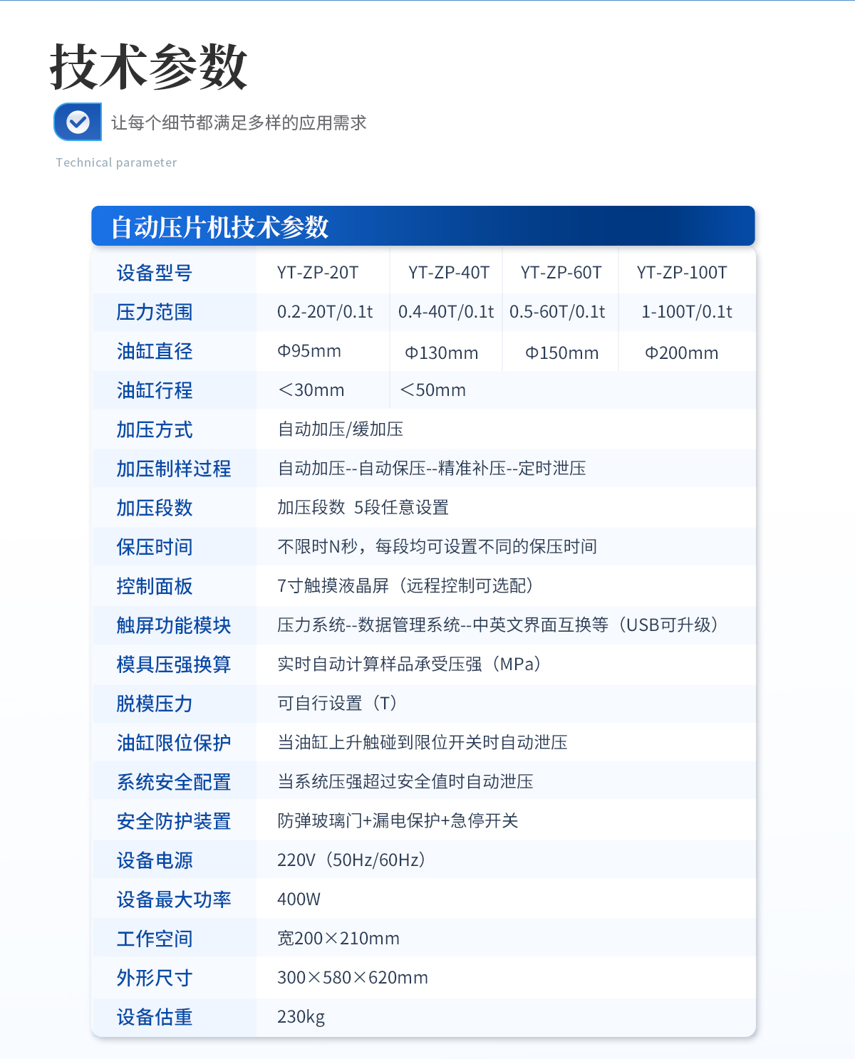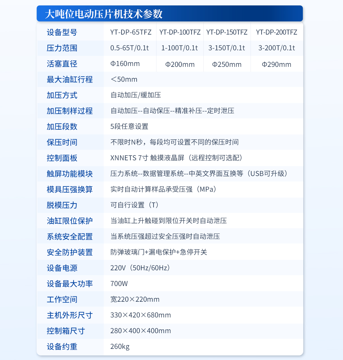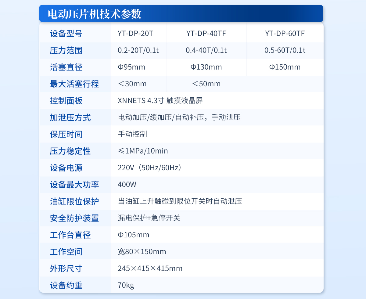 | 設(shè)備型號(hào):YT-DP-65TFZ | 壓力范圍:0.5-65T/0.1t | 油缸直徑:Φ160mm | 油缸行程 :<50mm | 加壓方式:自動(dòng)加壓/緩加壓 | 加壓制樣過(guò)程:自動(dòng)加壓--自動(dòng)保壓--精準(zhǔn)補(bǔ)壓--定時(shí)泄壓 | 加壓段數(shù):5段任意設(shè)置 | 保壓時(shí)間:不限時(shí)N秒,每段均可設(shè)置不同的保壓時(shí)間 | 控制面板:XNNETS 7寸 觸摸液晶屏(遠(yuǎn)程控制可選配) | 觸屏功能模塊:壓力系統(tǒng)--數(shù)據(jù)管理系統(tǒng)--中英文界面互換等(USB可升級(jí)) | 模具壓強(qiáng)換算:實(shí)時(shí)自動(dòng)計(jì)算樣品承受壓強(qiáng)(MPa) | 脫模壓力:可自行設(shè)置(T) | 油缸限位保護(hù):當(dāng)油缸上升觸碰到限位開(kāi)關(guān)時(shí)自動(dòng)泄壓 | 系統(tǒng)安全配置:當(dāng)系統(tǒng)壓強(qiáng)超過(guò)安全值時(shí)自動(dòng)泄壓 | 安全防護(hù)裝置:防彈玻璃門(mén)+漏電保護(hù)+急停開(kāi)關(guān) | 設(shè)備電源:220V(50Hz/60Hz) | 設(shè)備**功率:700W | 工作空間:寬220×220mm | 主機(jī)外形尺寸:330×420×680mm | 控制箱尺寸:280×400×400mm | 設(shè)備約重 :260kg | 配置說(shuō)明:主機(jī)1臺(tái),控制箱1臺(tái)!模具選配!可根據(jù)需求定制壓片機(jī)或模具 |